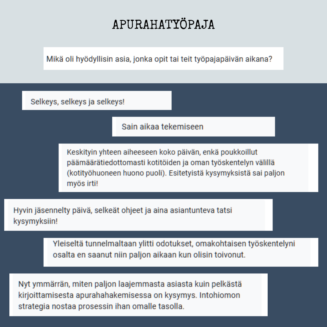 Intohiomo järjestää etätyöpajan, jonka aikana tuotamme hanke- tai työsuunnitelmaan tekstiä mukaansatempaavalla ja tehokkaalla menetelmällä.