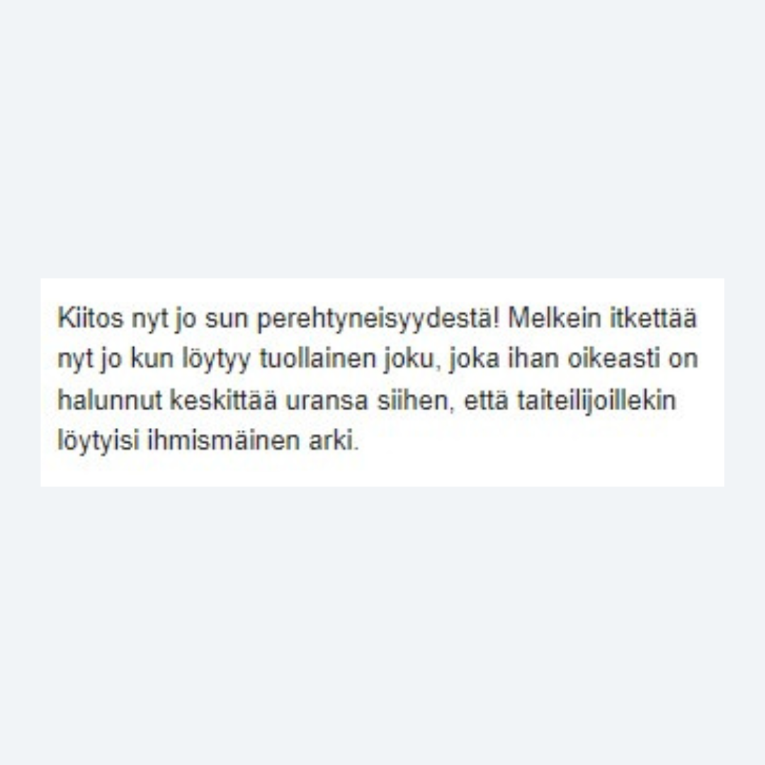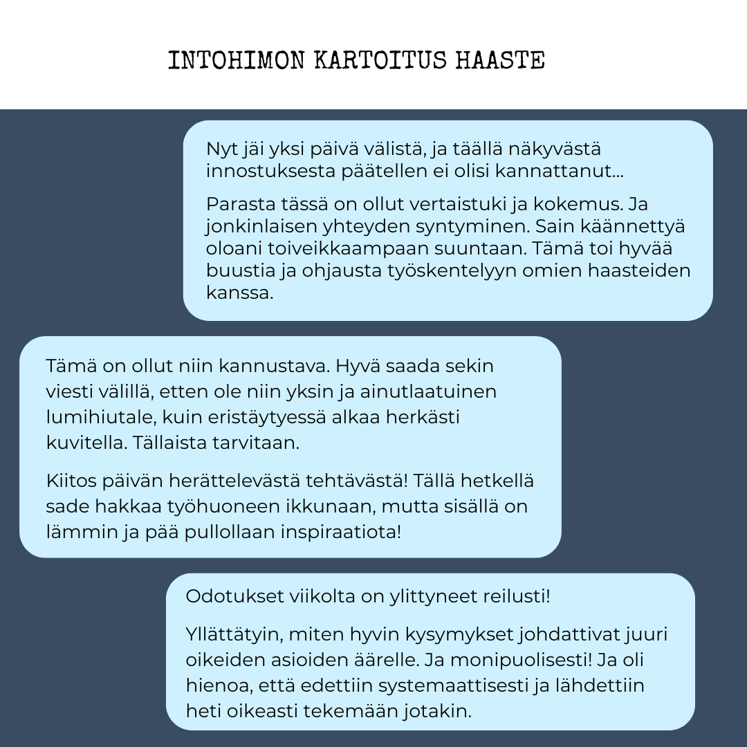 Intohiomo tarjoaa tuhansille luovan työn tekijöille apua, toivoa ja inspiraatiota maksuttomilla materiaaleilla sekä säännöllisellä sisällöllä eri kanavissa ja viikkokirjeessä.
