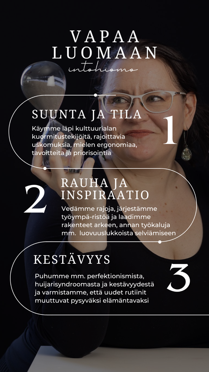 Jotta osaat rajata työtäsi ja keskittyä prioriteetteihisi sekä luoda rutiineja ja juuri sinulle sopivat joustavat rakenteet palapeliarjen pyörittämiseen. Jotta sinulla on työrauha ja mahdollisuus keskittyä luomistyöhön, ja nauttia siitä.